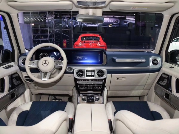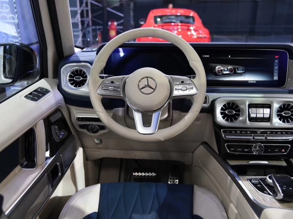 换代的最大最大亮点之一,给人耳目一新的感觉,双12.3英寸液晶通体屏幕外加与奔驰E (配置|询价) COUPE相同的空调出风口设计,让大G的内饰更加豪华,科技感也有所增强。沿用多年的四辐式方向盘也改为三辐式设计,三点以及九点处的多功能按键也与S级 (配置|询价)车型相同,两侧黑色触控按键可以控制仪表盘信息,其中行车电脑和右侧模拟仪表都可以进行切换,可显示油耗、续航里程、车辆状态等信息。在内饰用料方面,奔驰全新G级内部均采用了真皮材质包裹,手感极佳。在副驾驶台上还增加了碳纤维扶手,保护了车内人员在行车时的安全性。