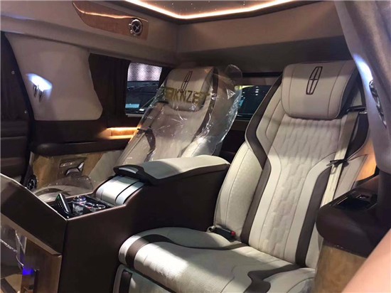 2019款林肯领袖一号内部2个电动座椅+中心电动吧台组合,能够成为一个小型会议室,地板是高档柚木地板,中心镶嵌铜条,手艺制造,便利打理,2个总统按摩座椅能够加热通风,180放平。全车内空气灯都是经过法国规划师之手,无时无刻不表现浪漫。