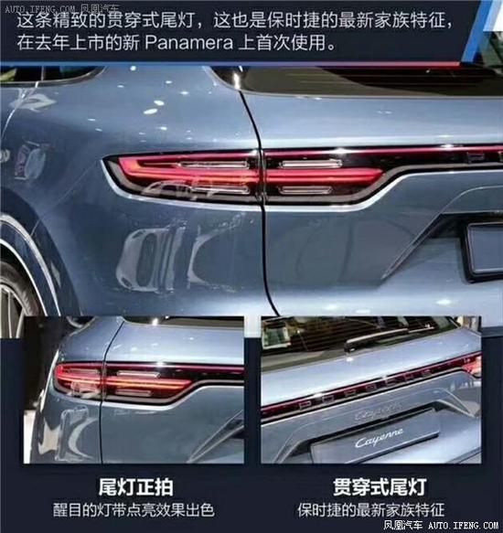 全新19款保时捷卡宴的尾部大改的地方主要是在其尾灯组,新车的尾灯组和老款车型相比更加细长,而且采用的是目前非常流行的贯穿式尾灯。这个尾灯组造型目前新款的保时捷911和保时捷帕纳梅拉 (配置|询价)均有采用。还有一点不同的地方就是新款车型在后保险杠下方增加了类似跑车扩散器的塑料饰板。此外,和老款车型一样Cayenne采用的是双边共两出矩形排气管,而Cayenne S采用的是双边共四出的圆筒形排气管,看上去运动感更强。