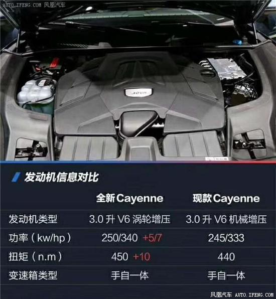全新Cayenne拥有可以媲美跑车的运动性,三款全新设计的涡轮增压发动机,为它带来更为澎湃的动力。全新Cayenne搭载3.0升V6涡轮增压发动机,最大输出功率为250 kW(340 hp),最高时速达245km/h。全新Cayenne S搭载的2.9升V6双涡轮增压发动机可产生324 kW(440 hp)的最大输出功率,最大扭矩达550 Nm,最高时速达265km/h。全新Cayenne Turbo搭载V8双涡轮增压发动机,最大输出功率为404 kW(550 hp),最大扭矩为770 Nm,最高时速达286 km/h,从静止加速至100 km/h仅需3.9秒,令人惊叹的加速度堪与911Carrera争锋。