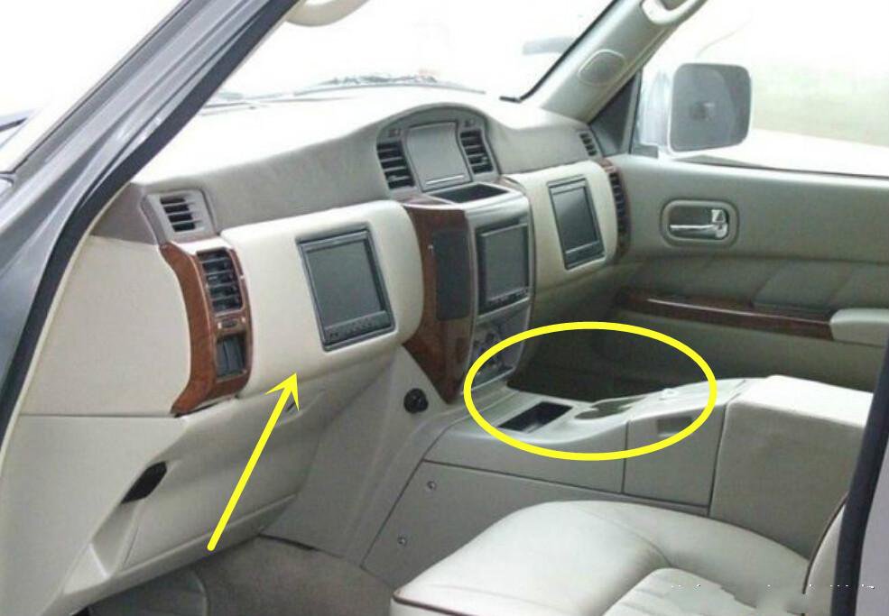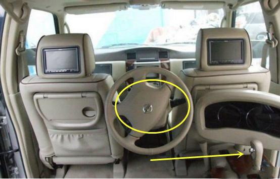 这辆日产SUV实际上的驾驶室其实位于后排座椅前,原来驾驶位置的正中央。而且,为了方便控制车辆,这名车主还把刹车,油门甚至是变速挡杆都通通搬到了后面。