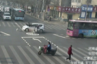 河南安阳一十字路口,一老大爷驾驶三轮车带着大妈,在红灯时从马路中央直穿而过,当场被撞飞,两人受重伤。因老大爷违反交通信号灯,三轮车负主要责任。