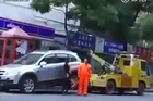 牛了!违章女司机将拖车拖走