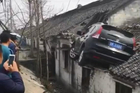这样的画面真是难以预见,汽车竟然一头栽进了屋顶,围观群众都很好奇,这辆车是怎么飞上去的呢?