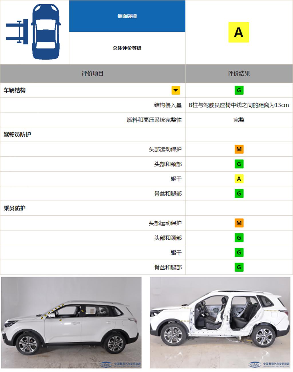 既然正好说起了侧气帘,我们就紧接着说侧碰,未安装侧面头部保护安全气囊的智跑驾驶员和乘员的头部保护都是M,说差也没那么差,但是头这个东西一个不巧还是容易一命呜呼。