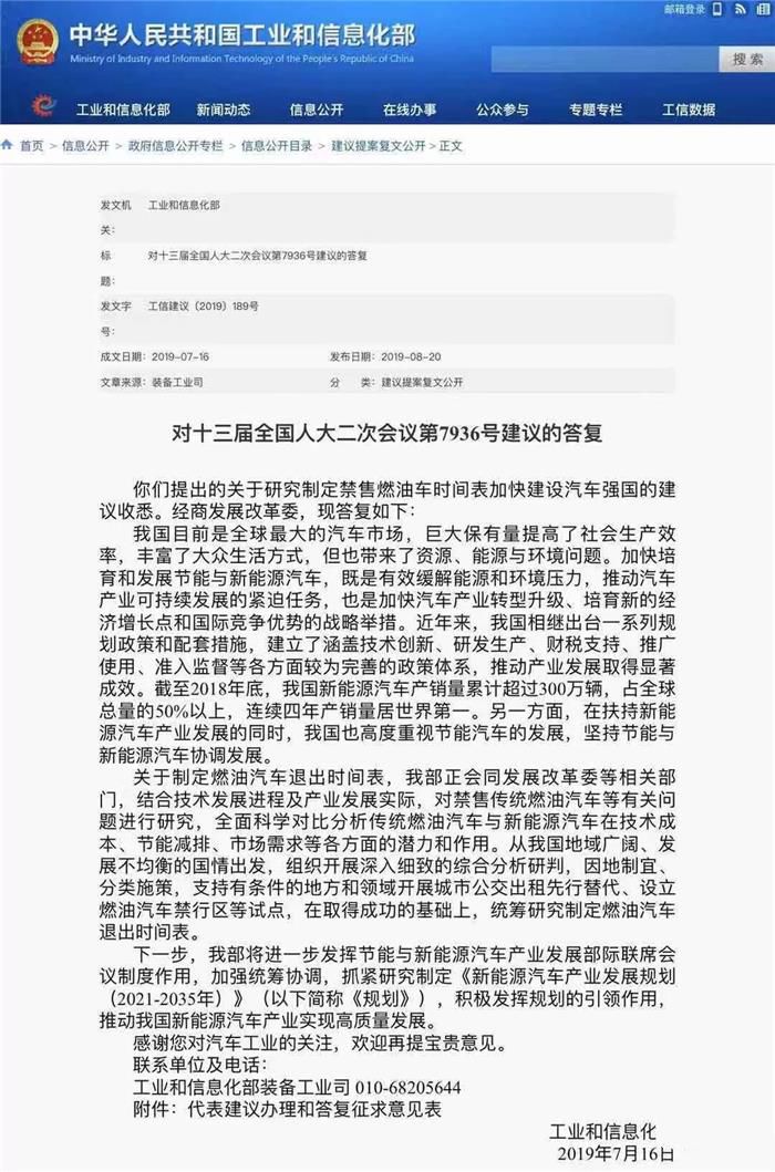 时间来到2019年8月20日,国家工信部在《对十三届全国人大二次会议第7936号建议的答复》中明确表示,正会同发改委等部门对禁售燃油车等问题进行研究,并且支持有条件的地方和领域开展城市公交出租先行替代、设立燃油汽车禁行区等试点,在取得成功的基础上,统筹研究制定燃油车退出时间表。工信部表示,下一步,将抓紧研究制定《新能源汽车产业发展规划(2021-2035年)》,积极发挥规划的引领作用,推动我国新能源汽车产业实现高质量发展。近期,中国能源与交通创新中心在发布的《中国传统燃油车退出时间表研究》报告中也称:在市场手段和政策手段两轮联合驱动下,中国有望在2050年前,实现传统燃油车全面退出。这也进一步表明,燃油车退出中国汽车市场,或许已不再是遥遥无期。