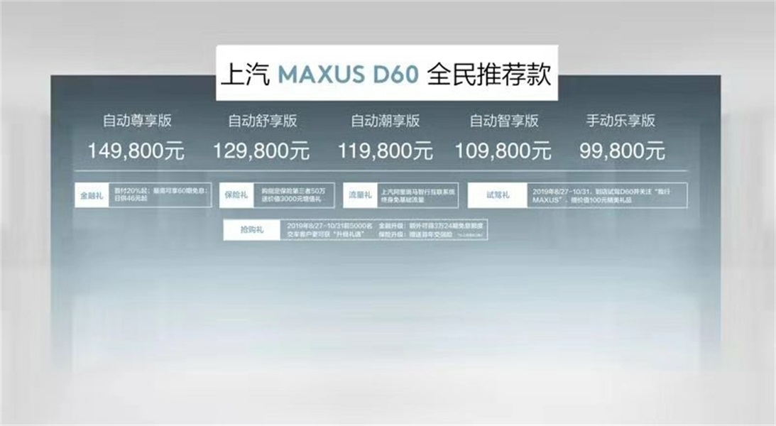 今晚(8月27日),上汽大通旗下中型SUV——MAXUS D60正式上市,新车共计推出5款车型,售价为9.98-14.98万元。动力上将搭载1.3T和1.5T两种动力,同时还可支持C2B定制这无疑是这款车最大的噱头了。那么这款车到底有什么卖点呢?跟小编一起来详细的了解一下。