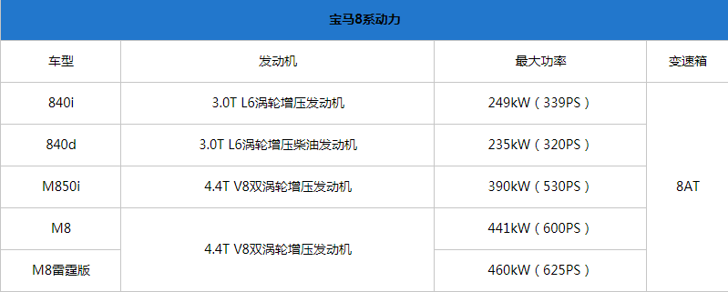 新一代宝马8系 (配置|询价)家族将于9月4日成都车展前夕上市。此前官方已经公布了新车预售价为97.00-120.00万。进口国内售卖的普通版8系仅有一款动力:840i,柴油版的840d和M Performance系列的M850i都欠奉。840i有双门版(G14)、敞篷版(G15)、四门版(G16)可选。
