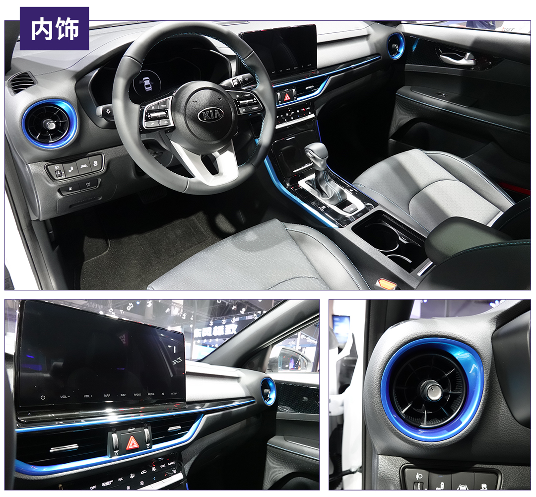内饰采用暗黑色的设计风格,保持时尚简约的同时,也兼顾到车内的科技感。主流的10.25英寸悬浮式液晶显示屏一目了然,中控屏左边7英寸的液晶仪表盘,三幅式方向盘采用皮质包裹,看上去质感十足。中控台和空调出风口采用蓝色或青色饰条,为内饰增添了不少活力。