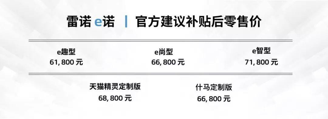 雷诺e诺最大的亮点还在于价格,补贴后6.18-7.18万元的价格,已经直逼传统属于自主品牌的价格区间,甚至比不少同级自主品牌车型还要便宜。考虑到纯电车型不需要购置税,落地6万余元就能拥有一辆雷诺品牌纯电SUV,对于年轻消费者来说应该颇具吸引力。