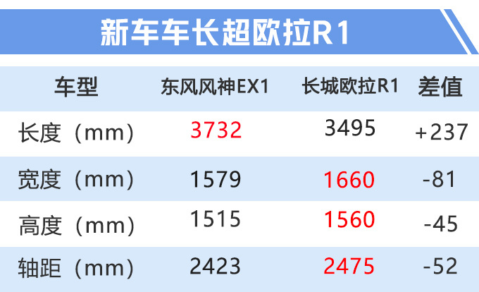 东风风神EX1电池总容量为26.8kWh,工信部NDEC综合续航里程271km,相比于同级竞品欧拉R1,在电池容量、续航里程方面都稍显不足。车身尺寸方面,新车车长远超欧拉R1。