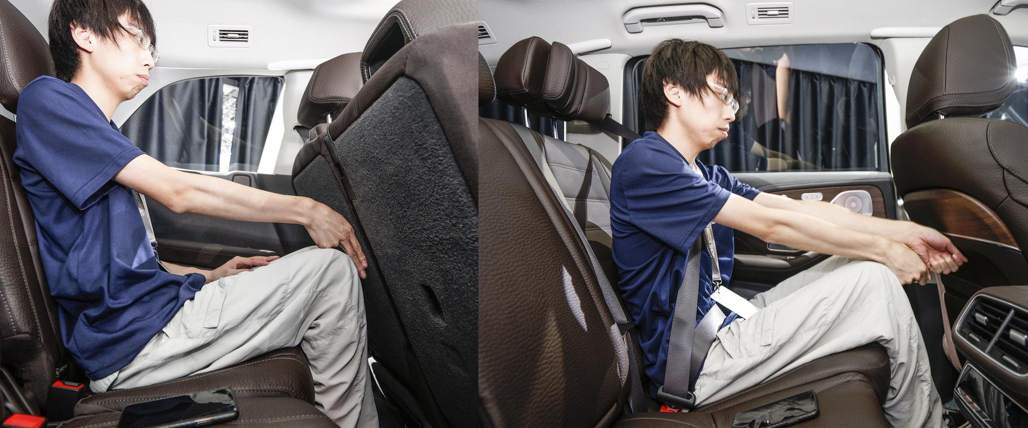 如果将第二排座椅调整到最靠前的位置,第二排腿部空间降为2拳;但第三排至少可以坐进去了,不过空间依旧不富裕,仅为2指。