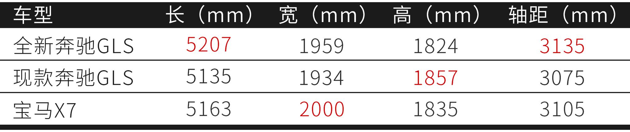 全新GLS(参数|图片)基于奔驰的MHA模块化平台打造,长宽高和轴距分别达到了5207/1959/1824/3135mm,除了在现款车型基础上有所提升以外,更是在轴距方面成功逆袭了宝马X7(参数|图片)。