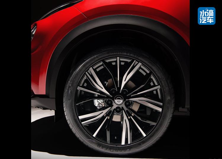 车身侧身,新车的造型非常丰富,拥有很强的雕塑感。腰线从前轮向斜上方延伸至尾灯处,车身比例十分协调,像极了双门SUV,然而这是一台五门车型,后排门把手采用隐藏式设计。此外新车还采用了双色车身设计,能够使车辆看起来更加动感。轮毂搭配的一款尺寸为19寸的轮毂,采用双色设计。