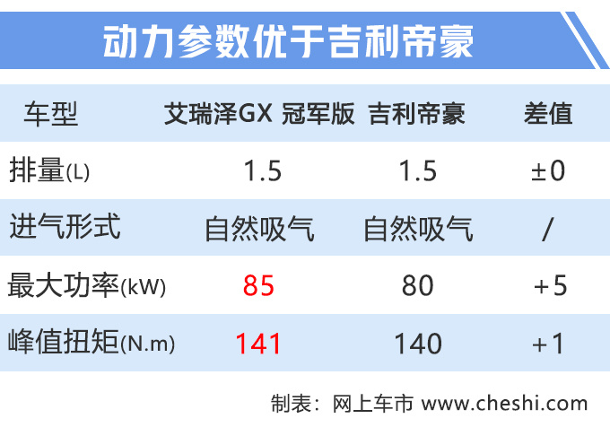 动力部分,艾瑞泽GX 冠军版将搭载与艾瑞泽5 (配置|询价)同款的1.5L自然吸气发动机,最大功率85kW,传动系统预计继续提供5速手动/CVT(模拟9挡)变速箱。新车综合油耗为6.9L/100km,满足国6排放标准。