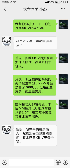 基于上述两款配置的车型对比,小编还是给同学更推荐本田XR-V一些。综合来看,外观和内饰的设计上本田XR-V的个性鲜明,更加符合年轻人的审美;而配置方面,7月刚上市不久的全新本田XR-V也增加了很多配置;空间方面本就是本田的优势,其MM的理念也在XR-V上得以延续,虽然车身尺寸略小于逍客,但是坐进去一点不觉得比逍客小;动力方面,本田1.5T带来的加速感受也要更加直接,而逍客的加速却有些“佛系”的感觉,不太符合年轻人对动力的预期。对于年轻人来说,本田XR-V才是购买小型SUV的首选。