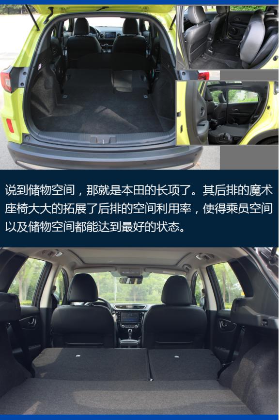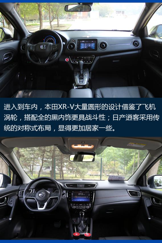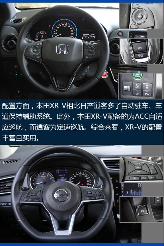 先从售价来看,东风本田全新XR-V(下面简称为本田XR-V),将老款1.8L发动机更换为地球梦1.5T发动机,1.5T车型的官方指导价为14.59万-17.59万元;日产逍客的官方指导价为15.49万-18.59万元,全系均为2.0L动力车型,两款车型的售价区间接近,但逍客价格要更贵一些。因此,我们选择本田XR-V的CVT 旗舰版和日产逍客的2.0L CVT豪华版,因为从预算以及配置的程度来看,这两款车型是最符合预期的。