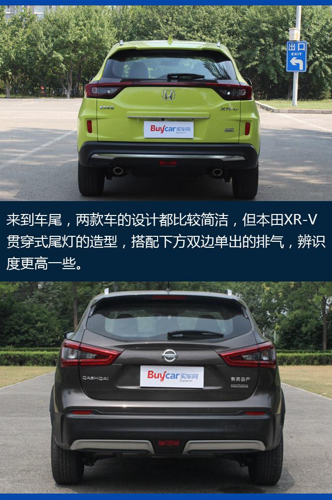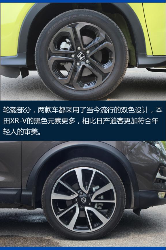 整体来看,本田XR-V在大量熏黑元素加持下,更加个性;而日产逍客是比较中规中矩的城市SUV造型,较为传统。