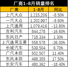 1-8月累计销量排名的前五位分别是上汽大众、一汽-大众、上汽通用、吉利汽车、东风日产,但受车市低迷影响,排名前五的车企中仅有东风日产实现了同比增长,其他厂商均有不同程度的下滑。即便如此,1-8月也只有“老三强”的累计销量突破了百万辆大关,遥遥领先与其他厂商。