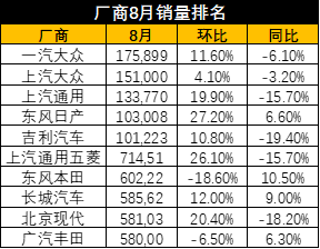 相比7月份,排行榜上的多数企业都有着不错的环比数据,其中上汽通用与东风日产8月的进步表现尤为突出,环比增速分别为19.9%和27.2%,有着明显的起势。