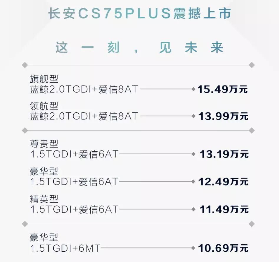 9月5日的成都车展上,备受关注的长安CS75PLUS (配置|询价)正式上市,代言人陈坤成为了第一位车主,而10.69-15.49万的售价相较预售时也有所降低,总体来说价格还是在大多数人的预料之中的。CS75PLUS此番上市的车型并不多,总共有6款,有两种动力、两种变速器可选,那么这其中又是哪款性价比最高呢?我们下文具体分析。
