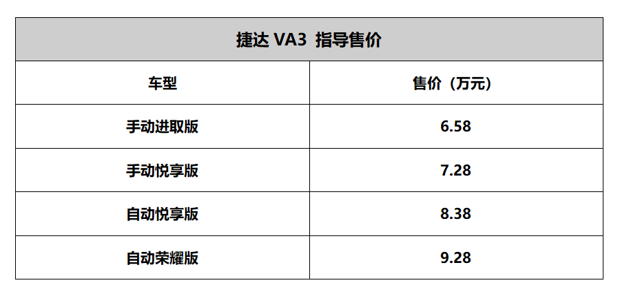 作为捷达品牌的首款轿车,VA3在很大程度上沿袭了现款一汽-大众捷达车型的设计,且以相同平台打造。若通过价格层面来看,新车售价更低,且相应的配置更丰富,是替代一汽-大众捷达的不错选择。