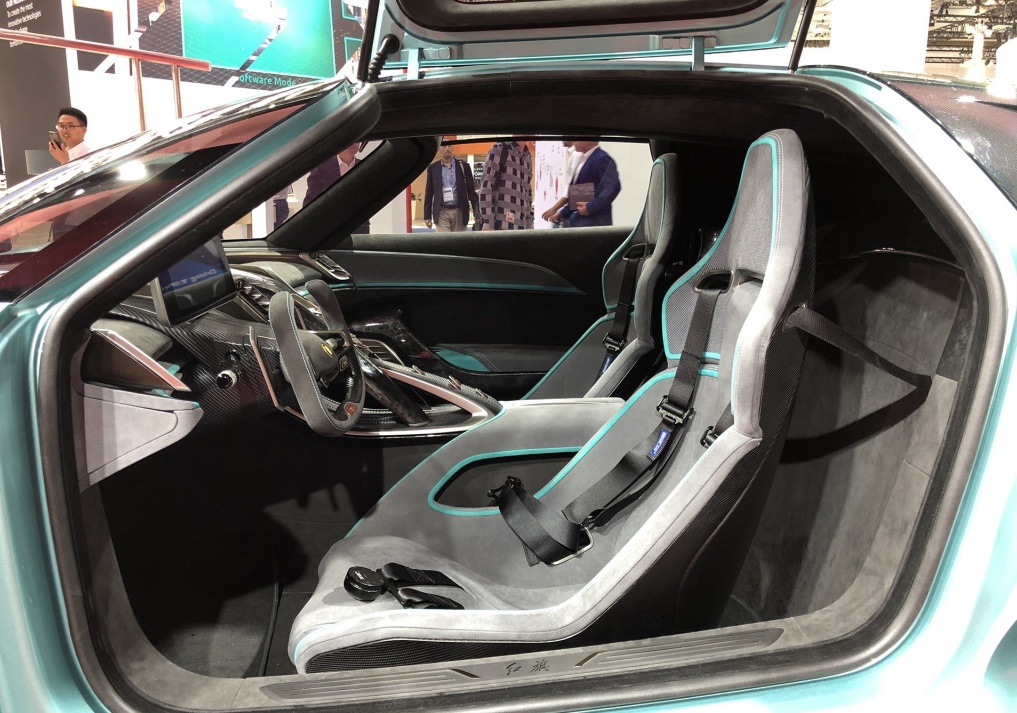 车的外部线条极具流线感,前大灯组采用全LED光源,内部采用了密集排布的灯带设计,看起来飘逸且帅气。车头中央,红旗全新的条带式LOGO鲜红闪亮。与此同时,我们也能从车头处看到一条由前包围进入、贯穿前舱盖而出的风道,该设计连同车尾巨大的固定式扰流板,将为整车带来更强大的空气动力学效应,从而提升高速行驶的稳定性。仔细看,这台车的碳纤维材质的使用非常多,一方面是为了美观,一方面马路这么大的一台车能做到这么快的加速成绩,车身轻量化的保证是一定要做到极致的。