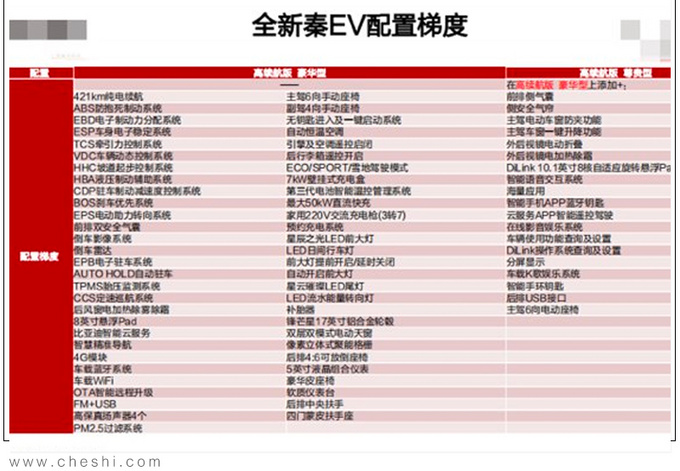 在今年的成都车展上,比亚迪全新秦EV (配置|询价)正式开启预售,两款高续航版车型预售价分别为13.98万、14.68万。近日网上车市获得了全新秦EV的配置表,新车搭载了丰富的智能安全配置,标配定速巡航、悬浮式中控大屏。据了解,这款车将于第四季度(预计10月)正式推向市场。