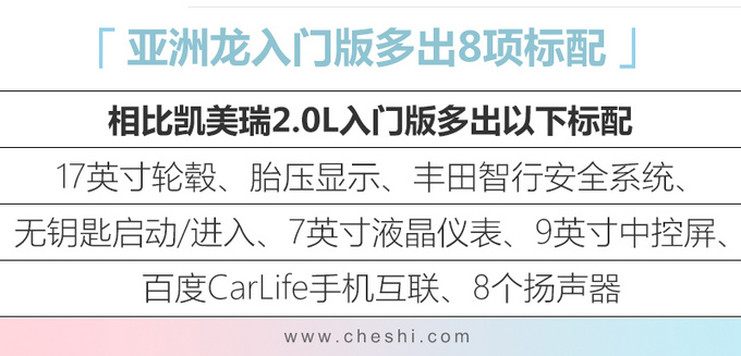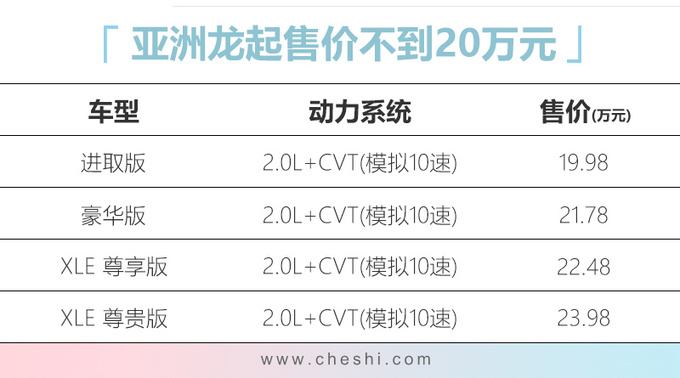一汽丰田在今年3月推出了全新旗舰轿车亚洲龙 (配置|询价),目前该车拥有2.5L汽油以及2.5L混动车型,月均销量保持在5-6千辆左右,2.0L汽油车型推出后在拉低售价的同时将进一步促进销量增长。9月27日,丰田亚洲龙2.0L车型正式上市,共推出4款配置车型,官方售价区间为19.98-23.98万元。与凯美瑞 相比,尽管新车起售价要贵2万元,不过尺寸更大,同时还多出了自适应巡航、无钥匙进入/启动、9英寸中控屏幕等8项标配。