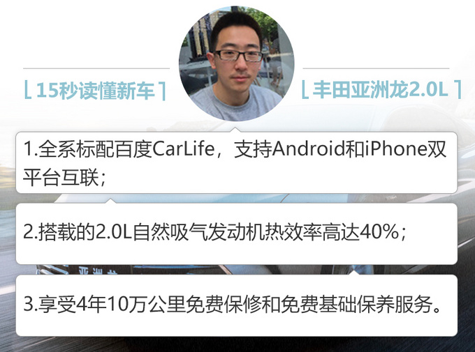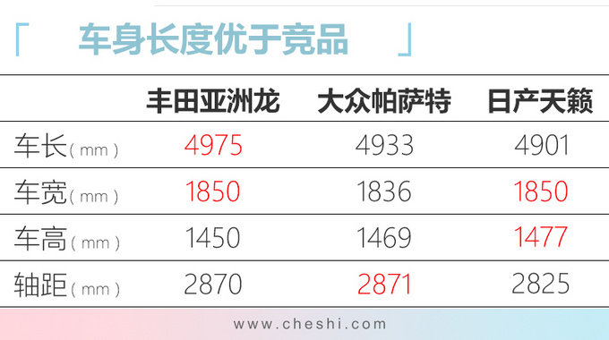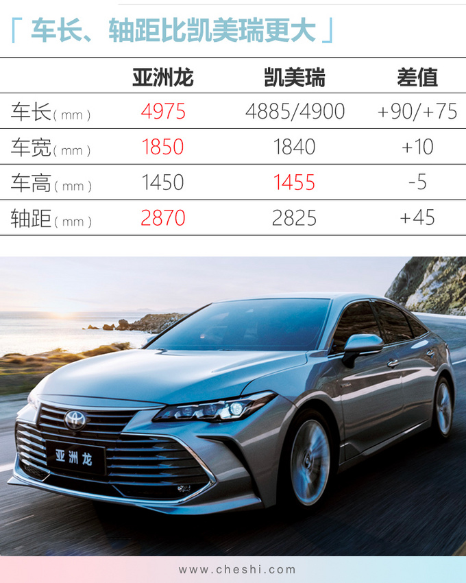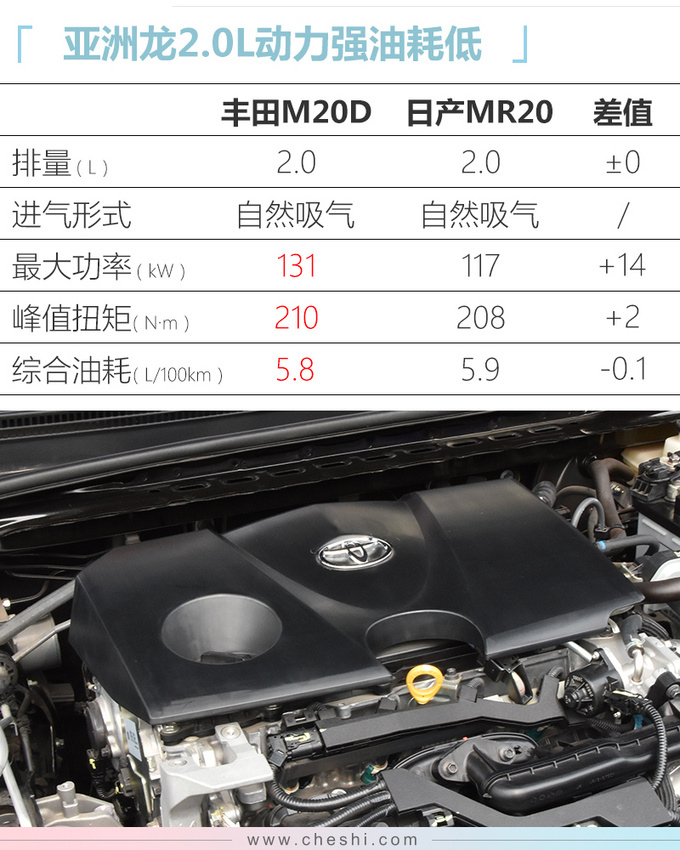 丰田亚洲龙2.0L车型车身尺寸保持不变,全系都没有配备AVS自适应可变悬架系统,稍显遗憾。动力方面,亚洲龙搭载2.0L自然吸气发动机,传动系统匹配CVT变速箱(模拟10挡)。2.0L发动机代号为M20A和M20D(分别为进口和国产),最大功率为131kW,峰值扭矩为210N.m,相比全新天籁 (配置|询价)2.0L等竞品占有优势,每百公里综合油耗仅有5.8L。