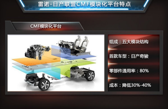 CMF模块化平台是雷诺-日产最新研发的技术,其将现有的C平台和D平台进行整合,将汽车被分成五个模块,包括发动机舱、乘员舱、前部底盘、后部底盘以及电气架构。对于雷诺-日产联盟而言,启用CMF平台生产之后,雷诺与日产车型零部件跨车型和跨平台的共享程度将大幅提升,零部件通用比例可达到80%左右,是目前数据的至少两倍。此外CMF平台理念能够有效降低生产成本30-40%左右,而零件采购成本也将随之降低20-30%左右。
