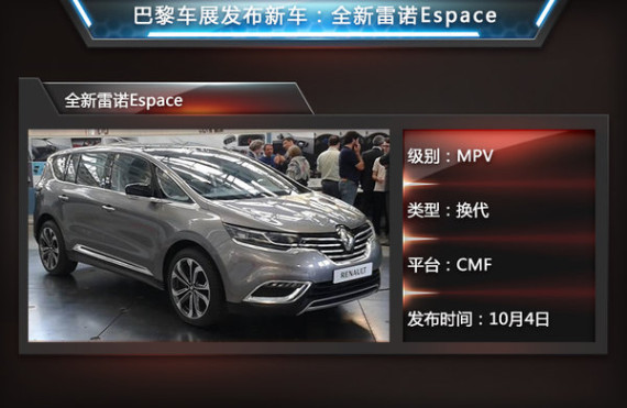 全新一代Espace有望成为雷诺首款基于该平台打造的产品,其将在今年十月举办的巴黎车展期间全球首发亮相,新车的外观将沿用Initiale Paris概念车的设计理念,从此前曝光的谍照来看,新车采用了全新的进气格栅设计,前保险造型也更加动感,预计新车将比现款车型更加突显豪华感。此外,新车将搭载多款涡轮增压汽油发动机和柴油发动机。(网通社 2014年9月30日 北京报道)