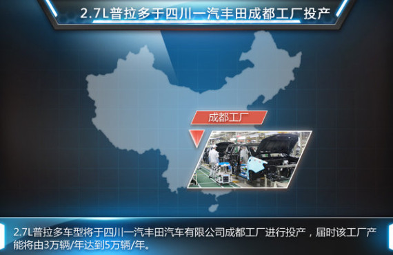 国产4.0L普拉多车型正是在四川一汽丰田汽车有限公司成都工厂生产,而2.7L车型也将于该工厂进行投产。目前,四川一汽丰田成都工厂产能为3万辆/年,明年一汽丰田追加投资金额将达约3亿多元人民币(50亿日元),预计将新招聘约500名员工,届时该工厂产能将达到5万辆。