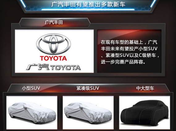 纵观广汽丰田产品线,目前有小型车致炫、紧凑级雷凌、中型车凯美瑞、凯美瑞·尊瑞、SUV汉兰达及MPV逸致,然而这样的产品阵容较其他合资厂商而言相对较少。因此,未来广汽丰田有望投产形成SUV产品体系,并增加C级车,进而完善产品阵容。