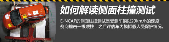 在造成致命伤害的车祸中有近四分之一来自侧面的碰撞,这其中很多种情况是一辆车撞向另一辆的侧面或撞上固定的细长物体,如道路两侧的树木或电线杆。为了验证车辆在这种情况下对车内乘员的保护是否充分,E-NCAP加入了侧面柱撞测试。测试车辆以29km/h的速度侧向撞击一根硬柱,撞击后再评估车内模拟假人受保护的情况。