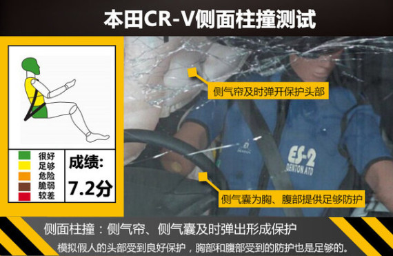 参加测试的本田CR-V为右舵车型,碰撞后驾驶员一侧车门因受力强大已严重变形,撞击中车辆的侧气帘及时弹出,对驾驶员头部提供良好的防护;同时侧气囊也为假人的胸部和腹部提供了足够的防护。本田CR-V的侧撞成绩为7.2分,5车中排在第4位。