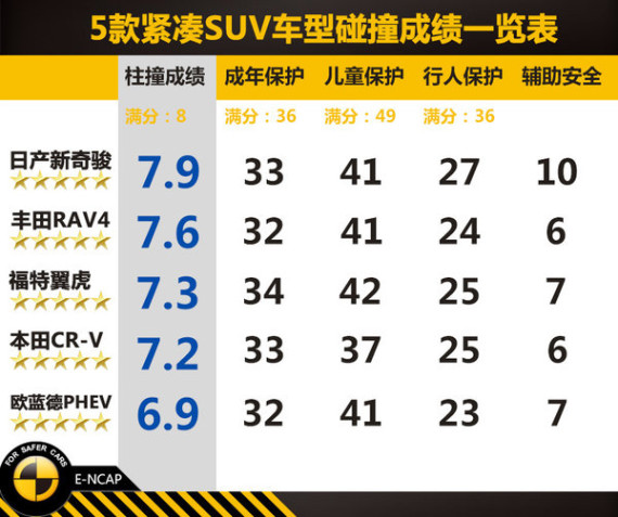 这次我们选择的车型分别为:日产新奇骏、丰田RAV4、福特翼虎、本田CR-V以及三菱欧蓝德PHEV(混合动力)。首先这5款紧凑SUV在E-NCAP的碰撞测试中总评全部拿到了最高5星评级,从侧面柱撞项目成绩上我们可以看出新奇骏得分最高,7.9分已经非常接近8分满分,测试车辆可以为乘员提供良好的安全防护。而欧蓝德PHEV此项测试最低,仅为6.9分,车内模拟驾驶员假人有受伤风险。其余4款车型测试成绩从7.6分至7.2分不等,假人均在碰撞中得到足够的防护。(注:参试车均为海外版车型,碰撞成绩仅供国内消费者参考)