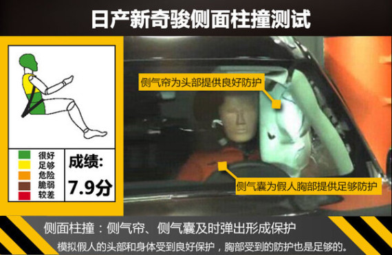 日产新奇骏已于今年正式上市,新车基于CMF模块化平台打造。相对老款车型,新奇骏在整车造型以及车辆配置等方面有了脱胎换骨的变化。在最为严苛的柱撞测试中,新奇骏的侧气帘及时弹出,对模拟驾驶员假人的头部形成良好的保护,同时侧气囊的弹出也使胸部得到足够防护。新奇骏的柱撞测试成绩为7.9分,已非常接近8分满分。