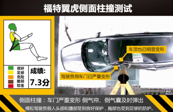 福特翼虎进入国内市场相对较早,这款热销的都市SUV无论外观和内饰都融入了更多的现代设计元素。翼虎在侧面柱撞后车门变形严重,同时能看出前排乘员上方车顶部已明显变形。车辆装备的侧气帘弹出对模拟驾驶员假人的头部形成良好保护,此外胸部受到的防护也是足够的。福特翼虎在这项测试中拿到了7.3分,成绩也较为理想。