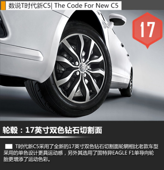 东风雪铁龙T时代新C5在外观方面的变化更趋向年轻化,犀利的前大灯加入“L型”的LED灯带和日间行车灯,通过立体双人标与中网相连,下进气格栅为多网格式设计。车身侧面线条流畅,突出的腰线设计贯穿了前后门扶手。T时代新C5采用了全新的17英寸双色钻石切割面轮辋,明显区别于现款车型单色的设计,而该款产品所选择了固特异EAGLE F1单导向轮胎也增添了整车的运动特性。