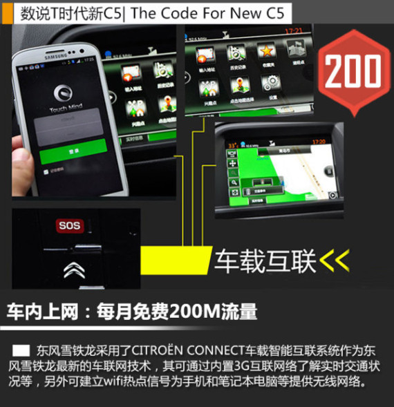 东风雪铁龙最新的车载互联系统,能够通过内置的3G互联网络查看交通、天气以及新闻信息,同时还可以为手机和平板电脑等终端提供无线网络。全新的车联网技术使用了联通3G网络,每月可免费使用200M流量。同时为给驾驶员提供更为人性化的设计,在中控台新增了紧急救援按键,驾驶员只需按下车内I-Call键3秒,即可连接呼叫中心,能够为车主提供道路救援以及导航点设定等功能。