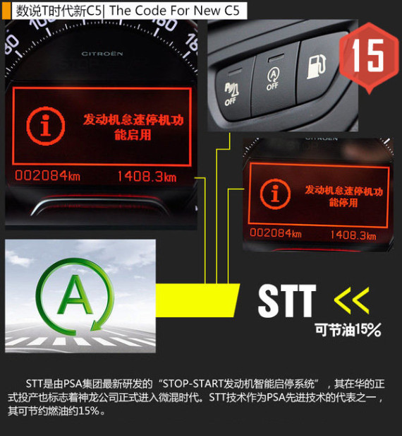 “T+STT”作为目前东风雪铁龙最为重要的动力总成,T时代新C5也同样采用了STT(STOP-START发动机智能启停系统),其是由PSA集团最新研发的微混技术并可实现15%的节油效果。根据厂商所公布的数据,得益于该项技术的应用,使得搭载1.6THP发动机的新款车型,百公里油耗仅为5.5L。