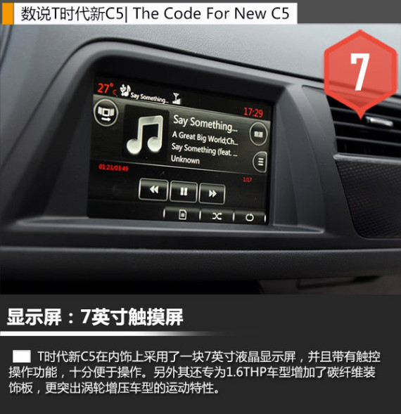 在内饰方面,T时代新C5的整体风格相同,不过碳纤维装饰板的应用则成为了1.6THP产品的专属部件,体现着1.6THP车型的运动风格。另外带有触摸功能的7英寸液晶显示屏,操控十分便捷,并且集成了CITROËN CONNECT车载智能互联系统为驾驶员提供了更为便利的服务。(网通社 2014年10月1日 北京报道)
