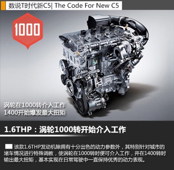 动力系统作为T时代新C5最为重要的改变,其增加了涡轮增压车型,该款车型所采用的1.6THP涡轮增压直喷发动机是PSA和宝马集团共同研发的小排量引擎,其在1000转时涡轮便开始介入工作,1400转时达到峰值扭矩,这使其初段加速能力得到了大幅提升。另外由于其中型车的市场定位,较大的体积使其加速性能呈现非常均匀的提速,增加了行车中的舒适性。