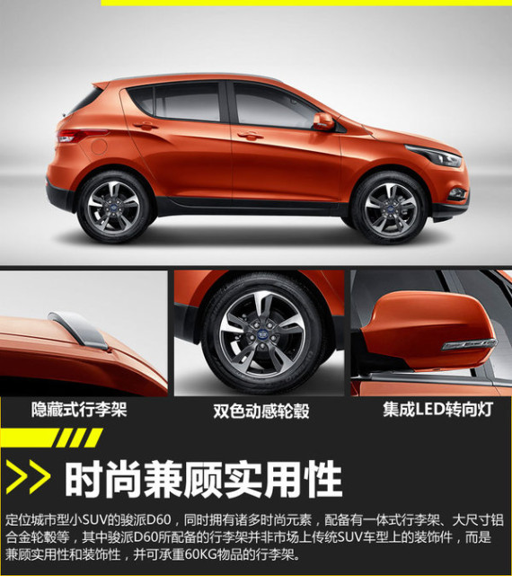 定位城市型小SUV的骏派D60,同时拥有诸多时尚元素,配备有一体式行李架、大尺寸的铝合金轮毂等,其中骏派D60所配备的行李架并非市场上传统SUV车型上的装饰件,而是兼顾实用性和装饰性,并可承重60KG物品的行李架。