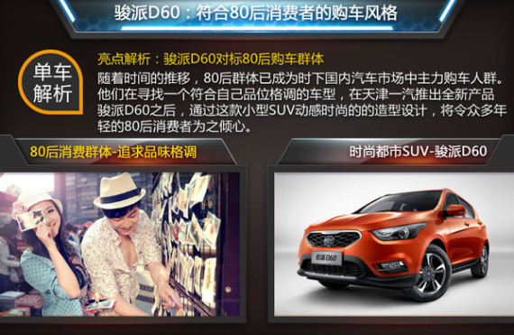 对于骏派D60的发布,此前天津一汽销售公司党仁表示:“新品牌首款SUV骏派D60定位为一款小型SUV,这将是天津一汽进军全新细分市场的崭新开端。”按照天津一汽对骏派D60的产品定位,新车将是一款针对年轻消费群体打造的产品,较夏利和威志车型更加高端。