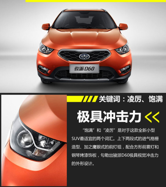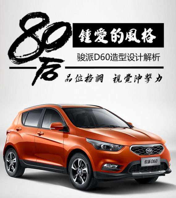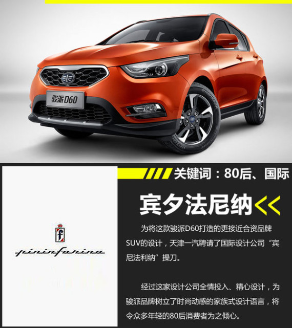 骏派是天津一汽发布的全新品牌,而骏派D60是天津一汽在经济型高端产品中布局的首款产品。为将这款新车型打造的更接近并超越合资品牌,天津一汽聘请了国际设计公司“宾尼法利纳”打造。经过这家设计公司全情投入、精心设计的小型SUV,为骏派品牌树立了家族式的设计语言,通过动感时尚的造型设计,将令众多80后消费者为之动心。