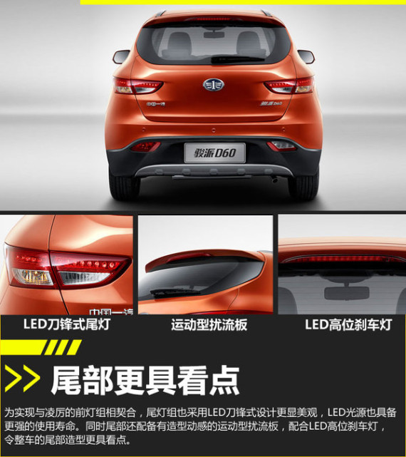 最后我们来看骏派D60的尾部造型,同样极具亮点。为实现与凌厉的前灯组相契合,尾灯组也同样采用LED刀锋式设计更显美观,LED光源也具备更强的使用寿命。同时尾部还配备有造型动感的运动型扰流板,配合长条的LED高位刹车灯,令整车的尾部造型更具看点。