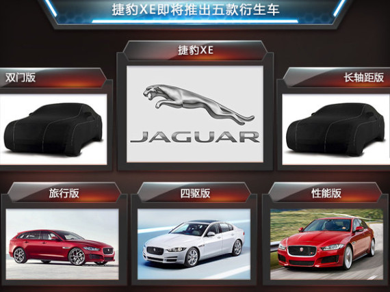 在2014年度巴黎车展上,捷豹全新中型轿车产品——捷豹XE进行了正式亮相。目前,与之同级别的奔驰C级和宝马3系轿车均已推出多款衍生车型,在此情形下捷豹也将顺应趋势推出XE的衍生车型。近日,捷豹XE车型的项目总监Nick Miller表示:“双门版以及旅行版XE将会在未来推出,并且XE四驱版本已进入准备阶段。”他还提到:“5.0升机械增压V8发动机未来会搭载于XE R或XE R-S等高性能版本车型。”