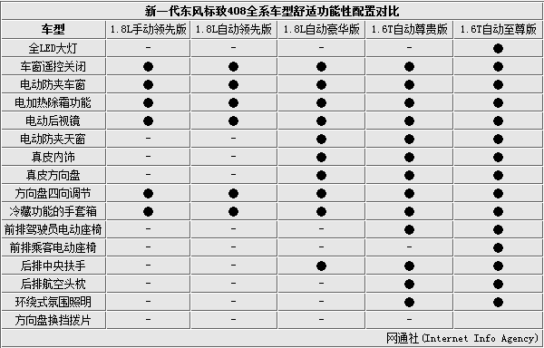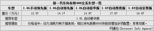 全新推出的408在紧凑级市场拥有绝对的竞争力,不论从动力、油耗还是配置都较老款车型有大幅度提升,具备了热销车的潜质。综合配置和动力各项数据,如果选择囊中羞涩,那么1.8L车型中豪华版堪称首选。它价格适中,配置又相当不错,对比舒适版车型增加了多项实用性配置,真皮内饰更为“高大上”。此时有人会说1.6T动力更强顶配车型配置更为华丽,无可否认至尊版的配置确实非常高,如果有充足的预算值得考虑。(网通社 2014年10月14日 北京报道)